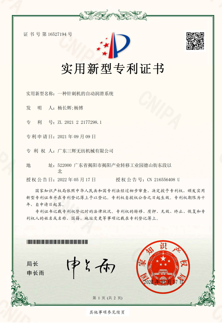 2019 Guangdong Province High-tech Product Certificate One-step Filtration Needle Punching Machine CNC production line
