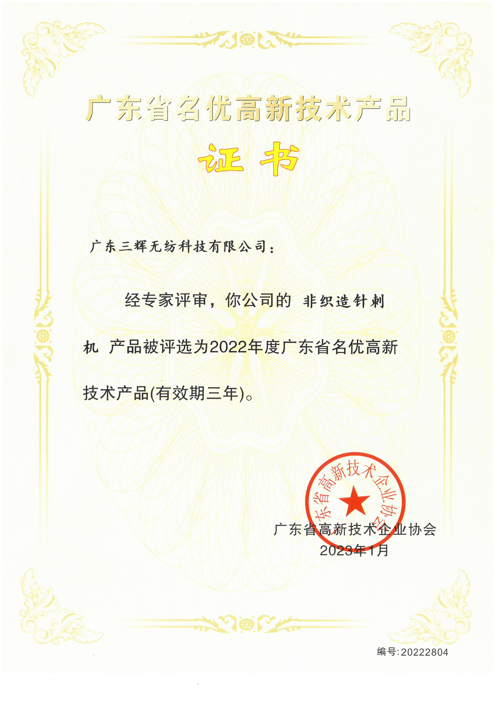 2016 Guangdong High-tech Product Certificate (one step filtration needle punching production line)