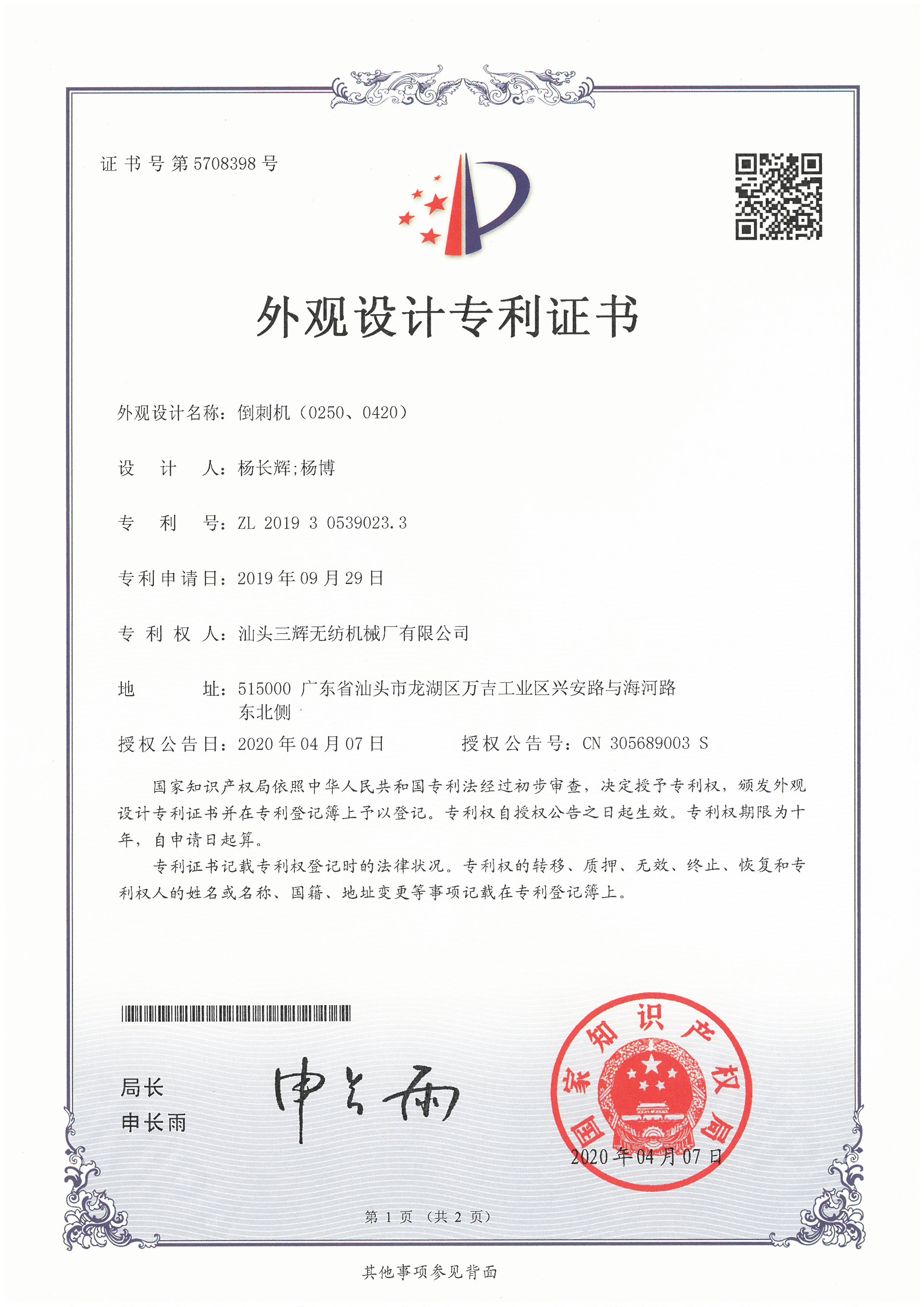 First Prize of Shantou Science and Technology Award (integrated suction and pressure air-laid carding machine)