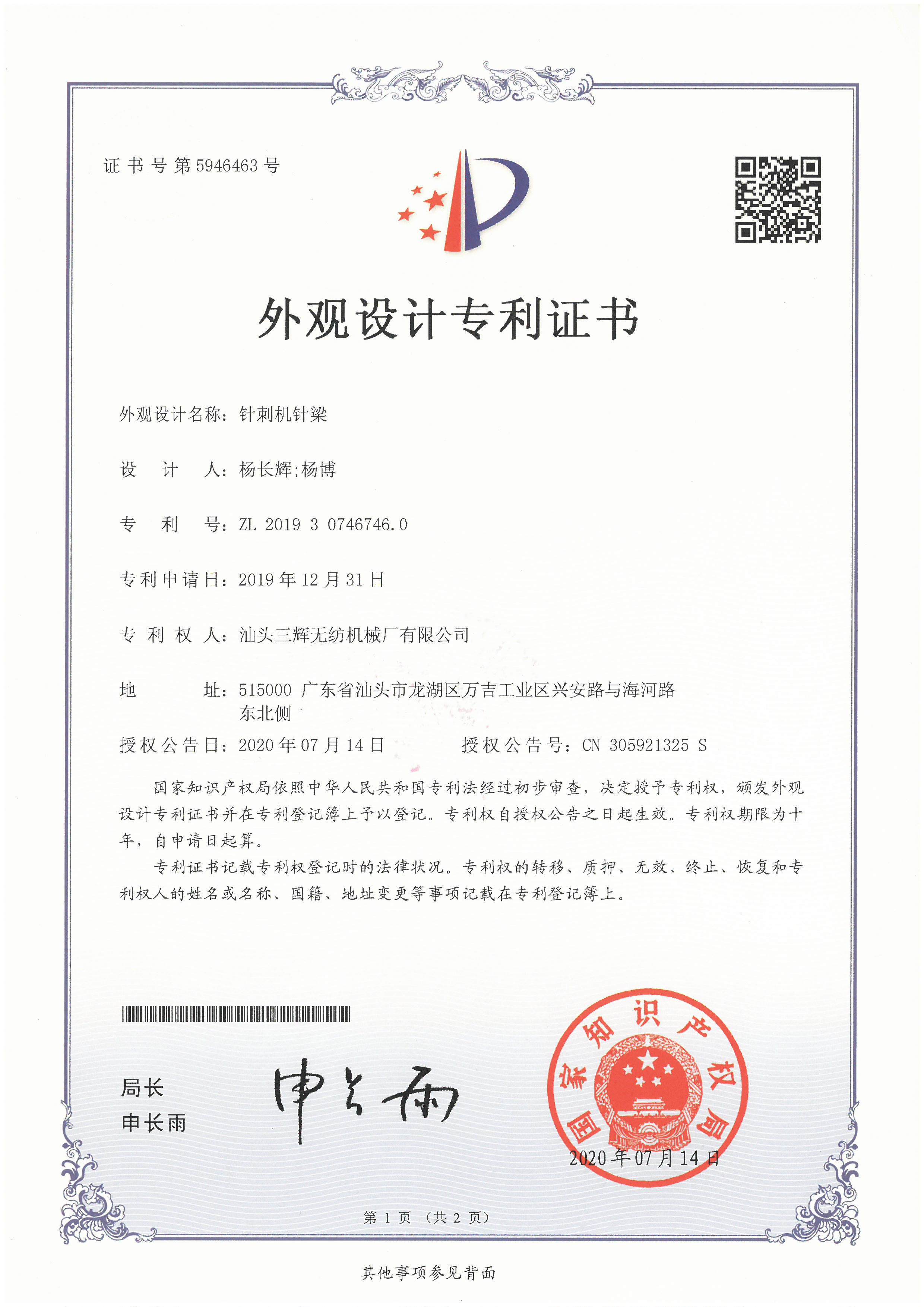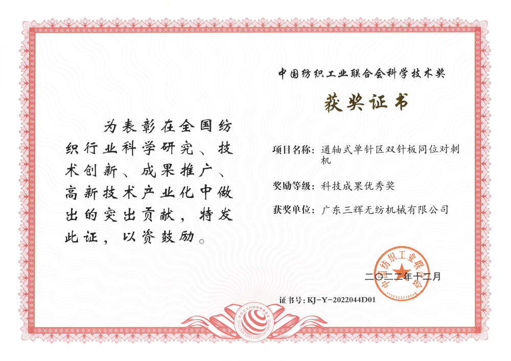 2016 Third Prize of Guangdong Science and Technology Award (Research and application of key technology of one step filtration needle punching production line)