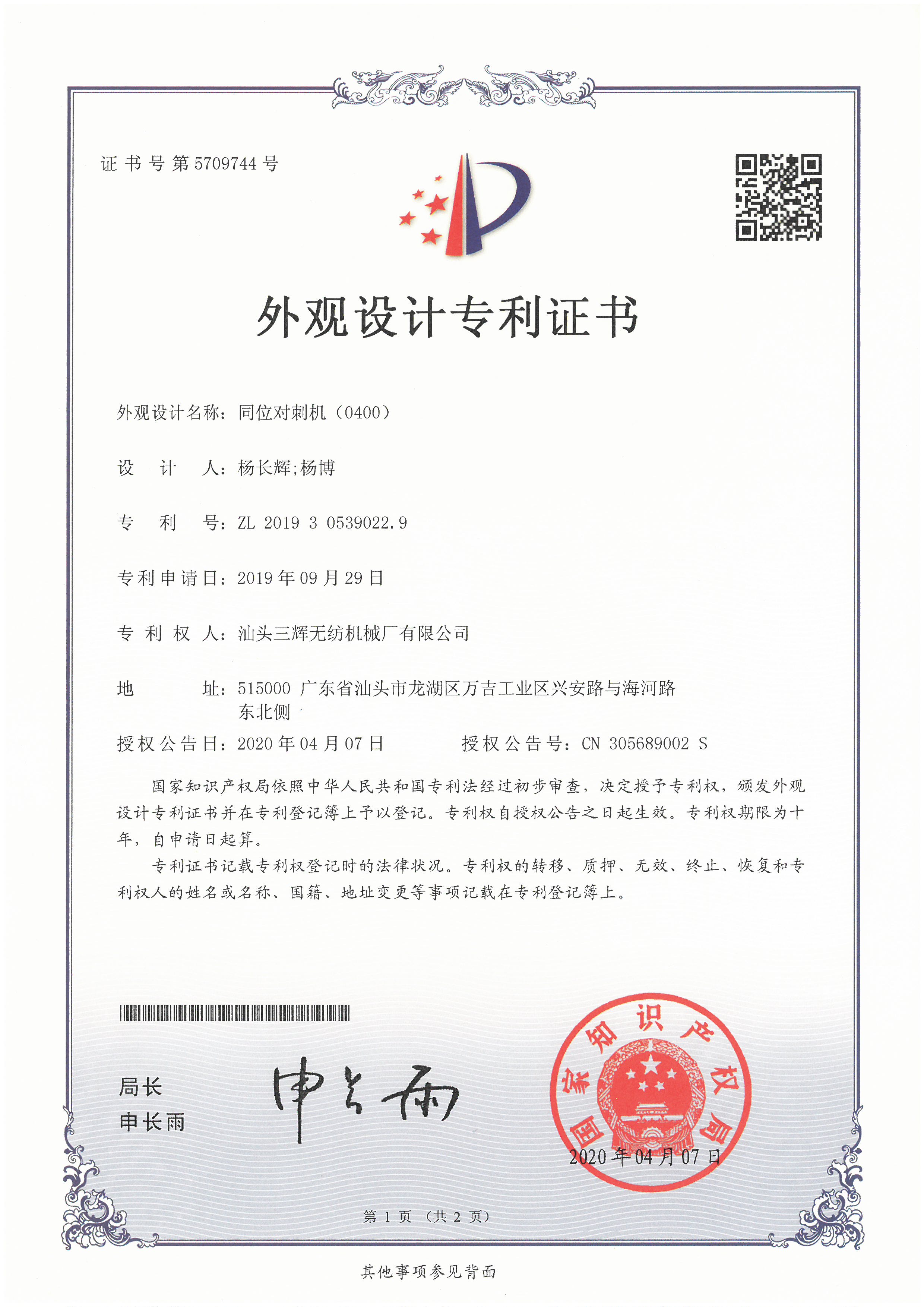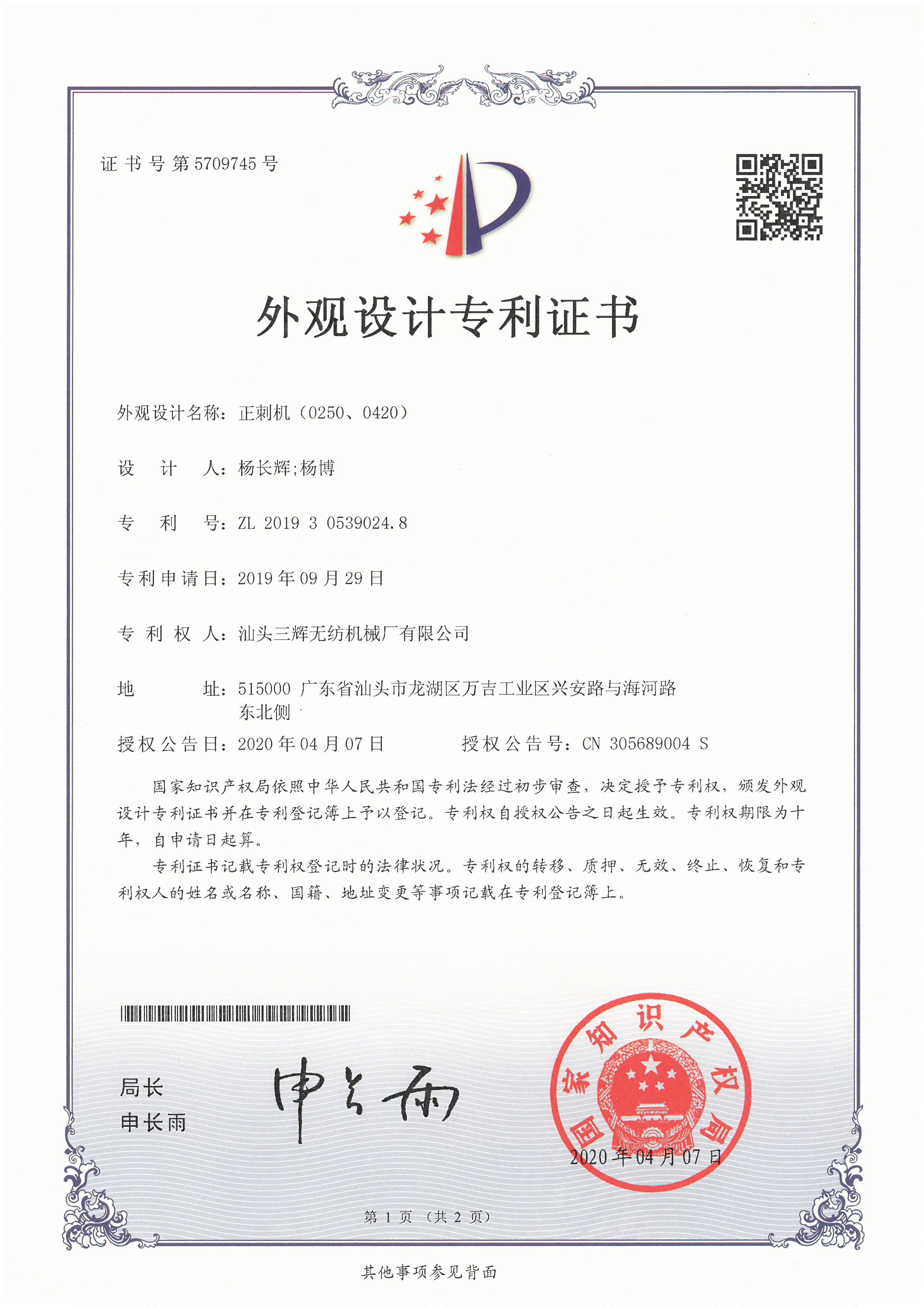 First Prize of Shantou Science and Technology Award (Research and application of key technology of one step filtration needle punching production line)