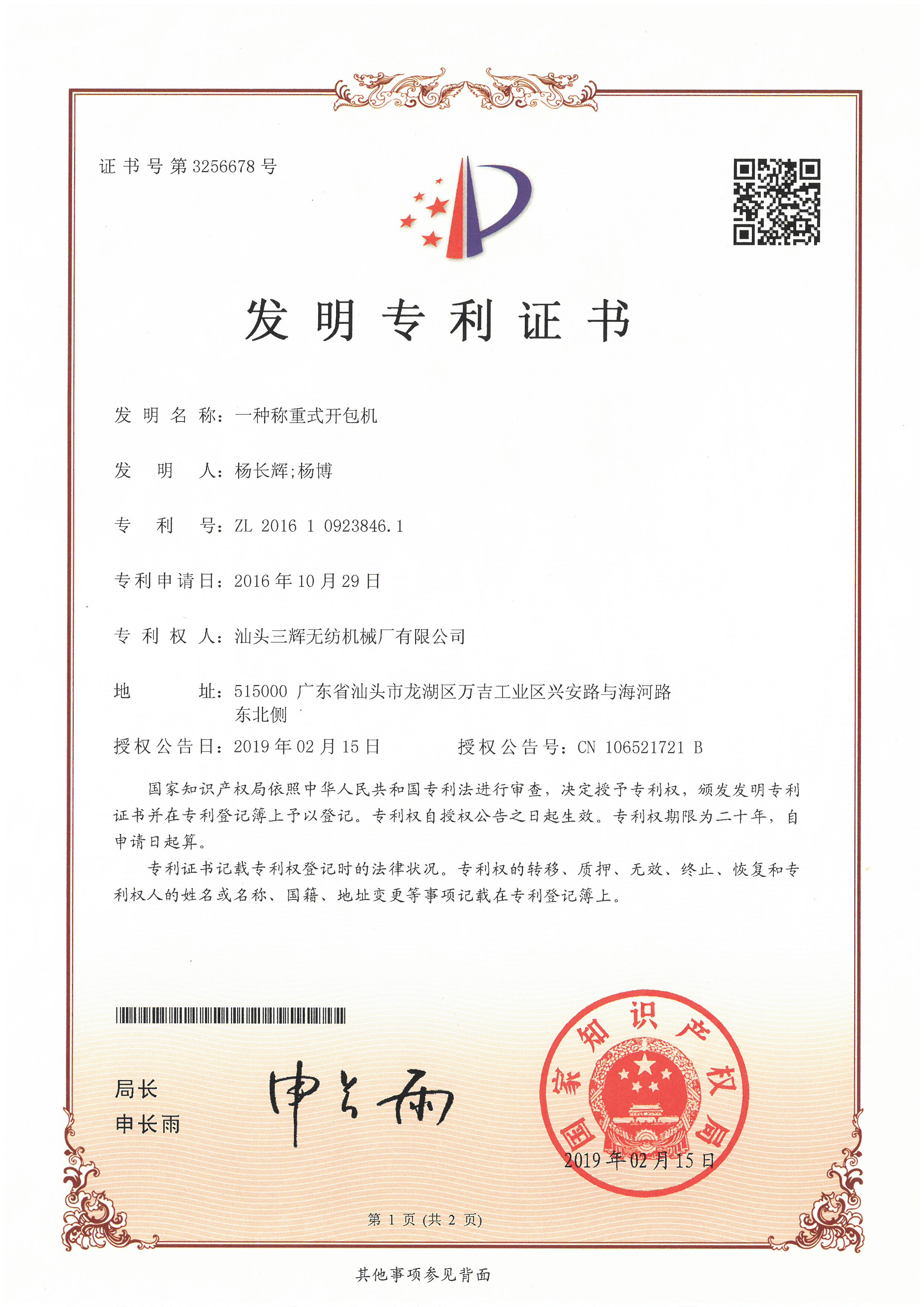 Second Prize of Shantou Science and Technology Award (Opening machine, Model SUSF011B-0120)