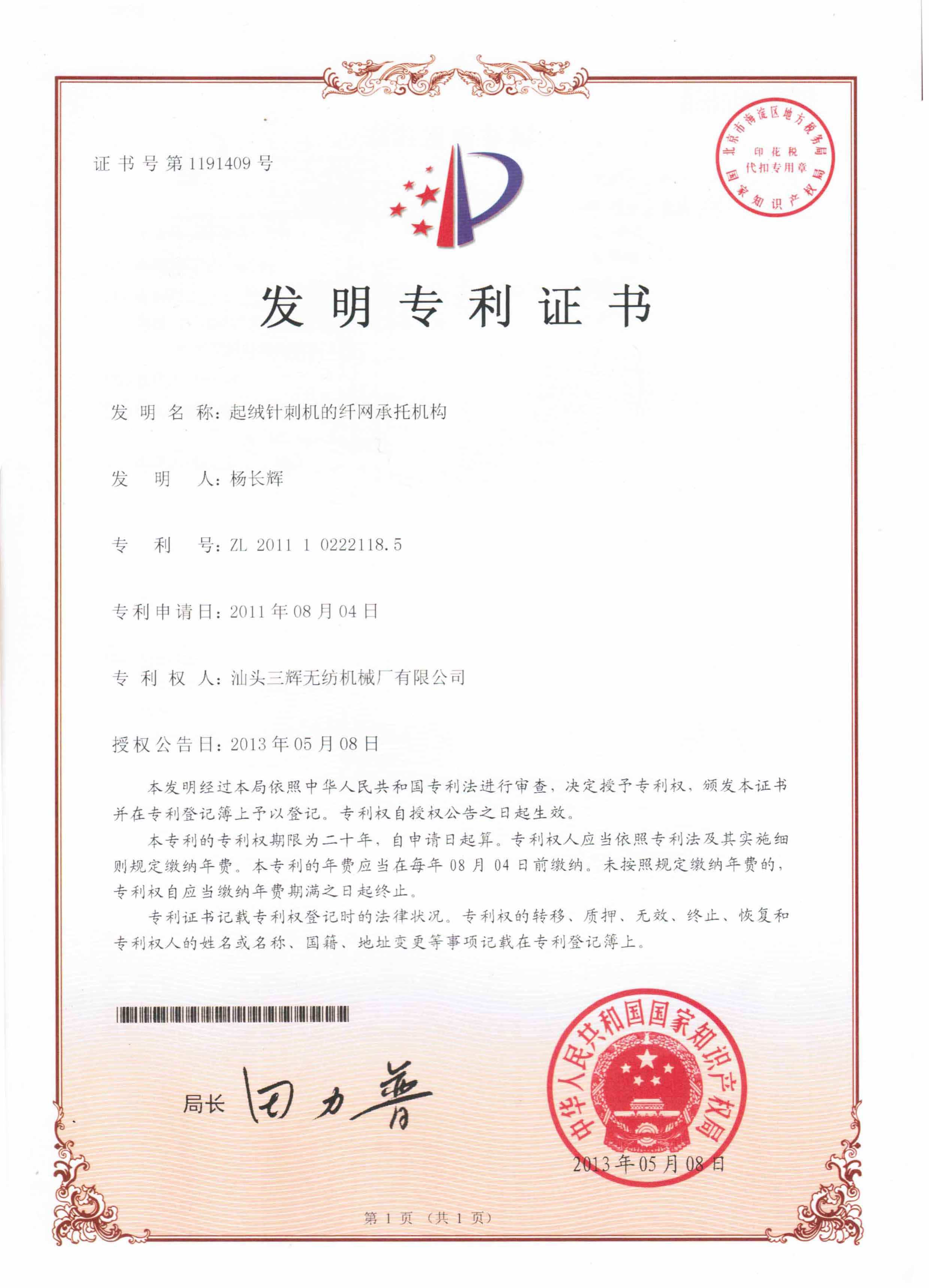 2012 Third Prize of Guangdong Science and Technology Award (Wide working width high frequency velour needle punching machine)